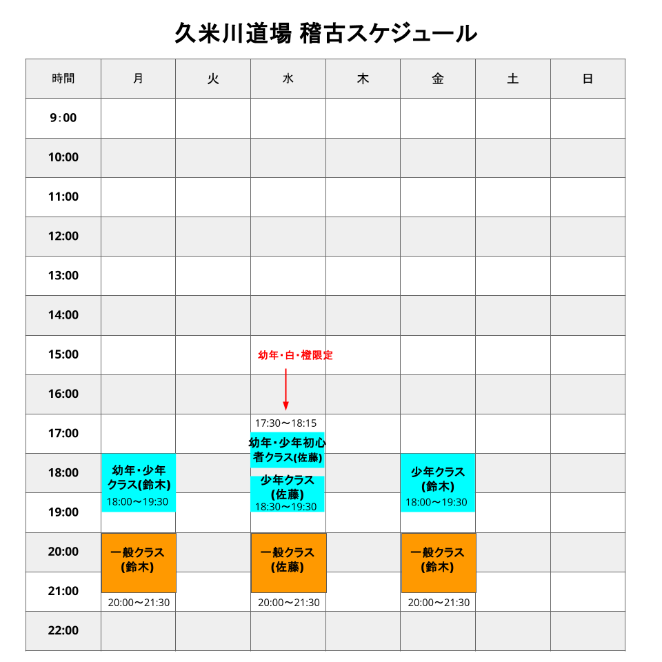 久米川道場 アクセス 郵便番号〒189-0013 住所東京都東京都東村山市栄町2-21-5 森田ビル5F TEL03-3363-8430 最寄り駅西武新宿線 久米川駅徒歩3分 時間割 2026年4月1日以降は金曜日の幼年・少年初心者クラスと少年クラスが統合され以下のスケジュールとなります