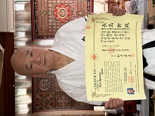 この度は、黒帯(初段)を拝受致しました。極真会館松井館長、岩田師範、諸先輩、皆さんのご指導の下、憧れの黒帯を絞めました。道着を着て黒帯を絞めると、走馬灯のように様々な想いが浮かびました。中学二年生で池袋の総本部に入門し、極真会の胸のマークに感激し、総本部の稽古の厳しさから何度も足を引きずりながら帰ったこと、当時は喧嘩が好きでたびたびストリートファイトをしていましたが、道場の組手が怖くて怖くて逃げだしたかった事、そして結婚、子育てで空手から離れていた事、道場から離れていた際も空手とは接点があり、K-1からのプロダクション依頼でアンディ選手とCM撮影時にご一緒してライトスパーリングや腹の叩き合い下段蹴り合いが懐かしい思い出です。その関係でホースト選手・アーツ選手とも知り合えました。その後、浅草道場に再入門、当時の松井支部長とお会いし稽古をさせて頂きました。そして大山倍達総裁のご逝去に接し、青山墓地での葬儀に参列。何度も挫けて何度も退会しました。