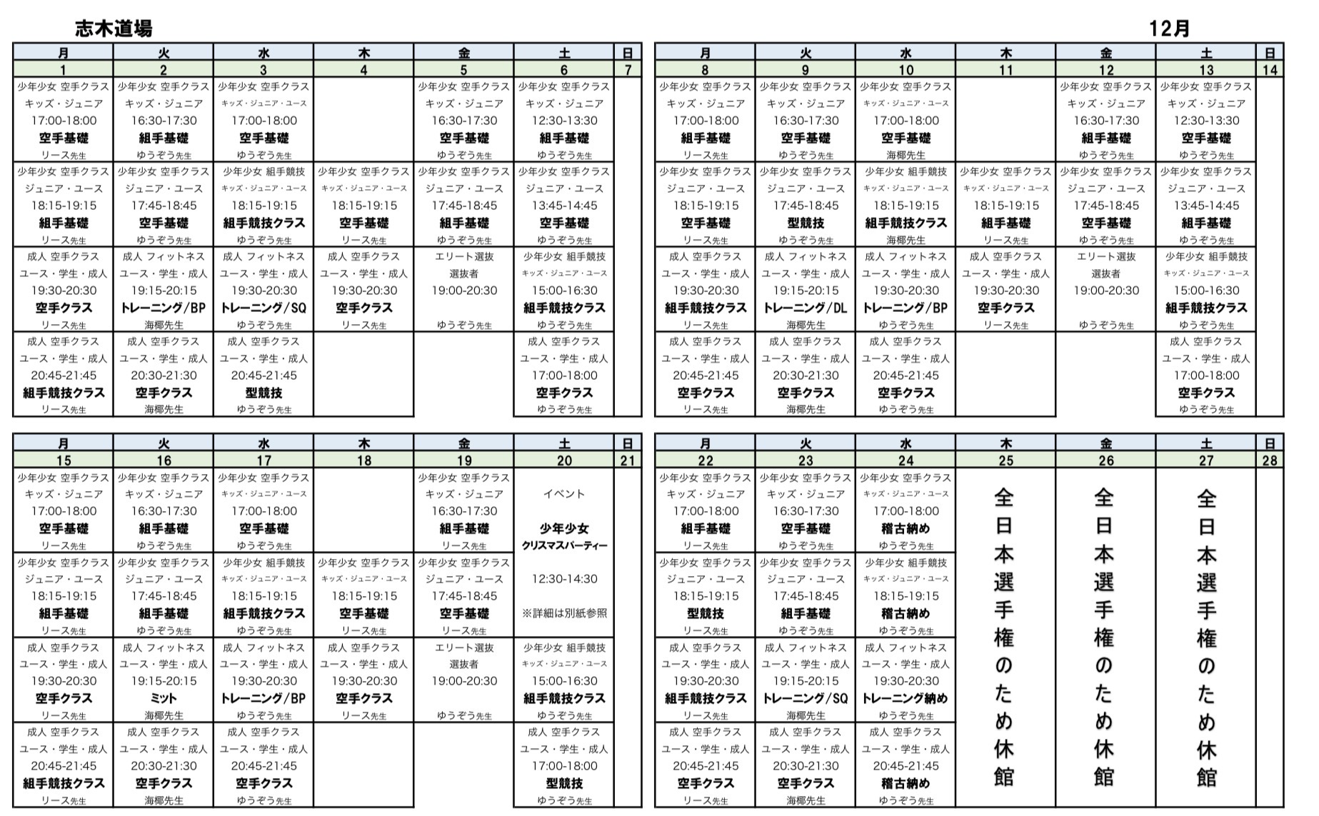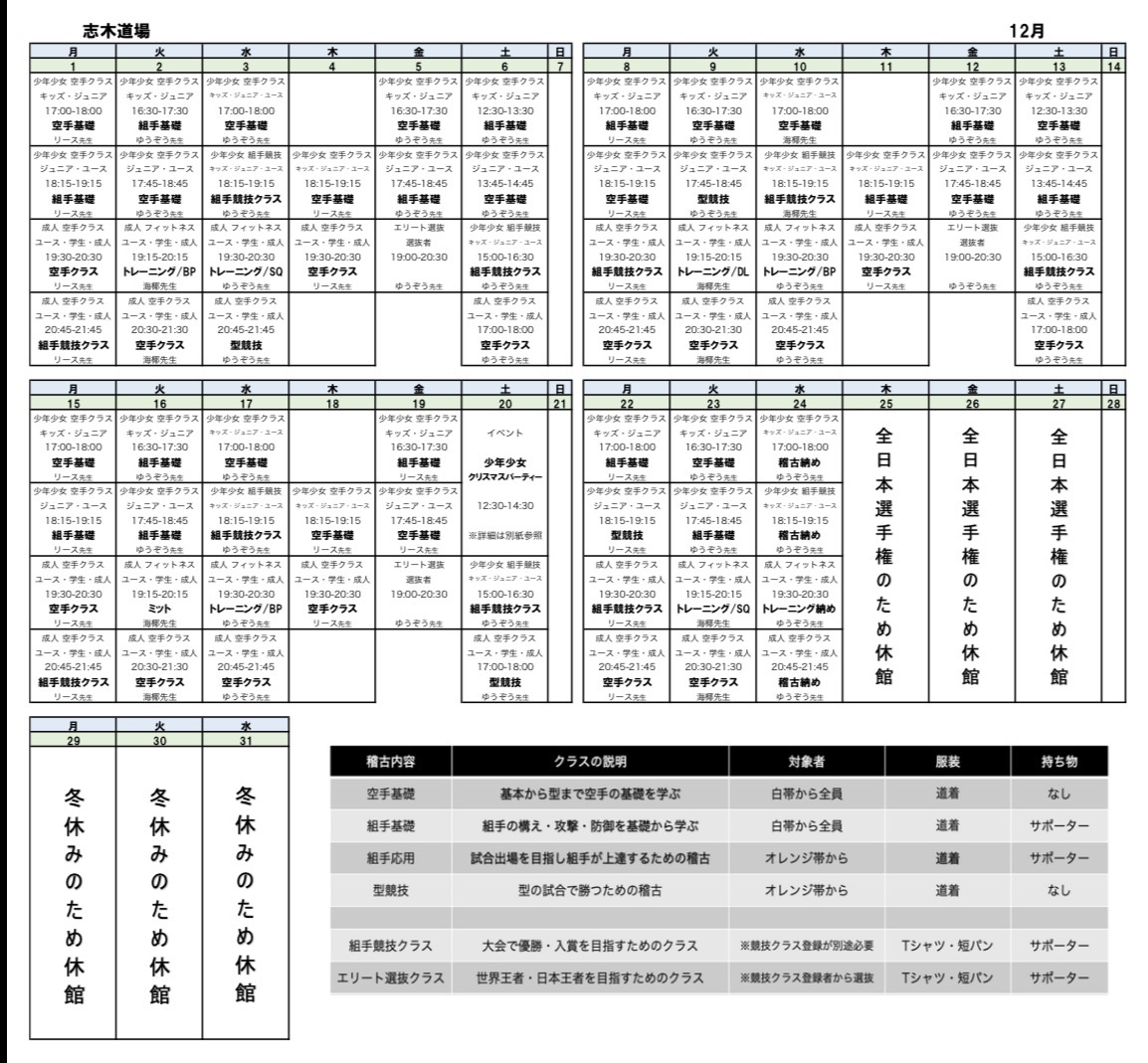 12月の稽古内容スケジュールです。ご確認ください。